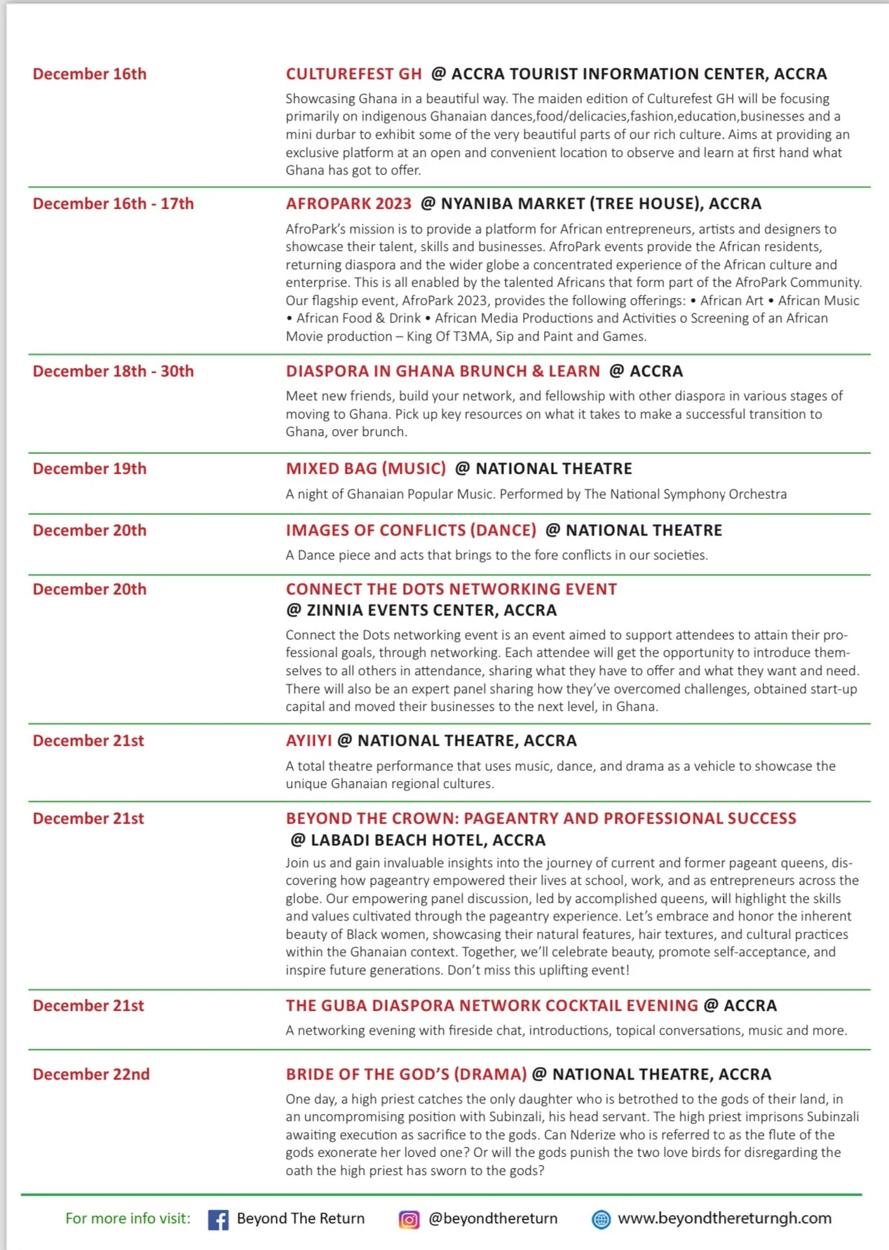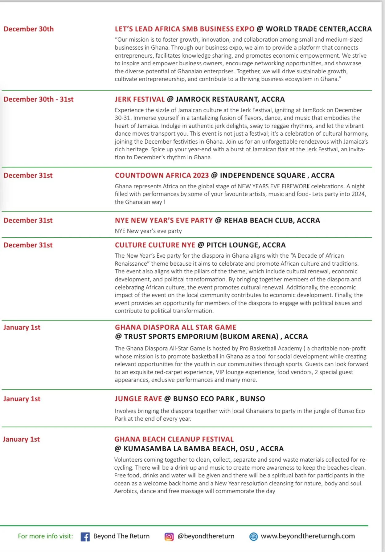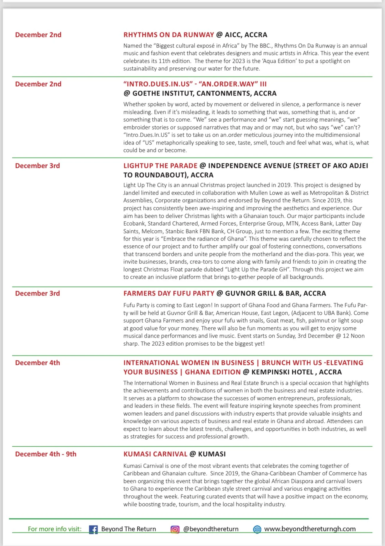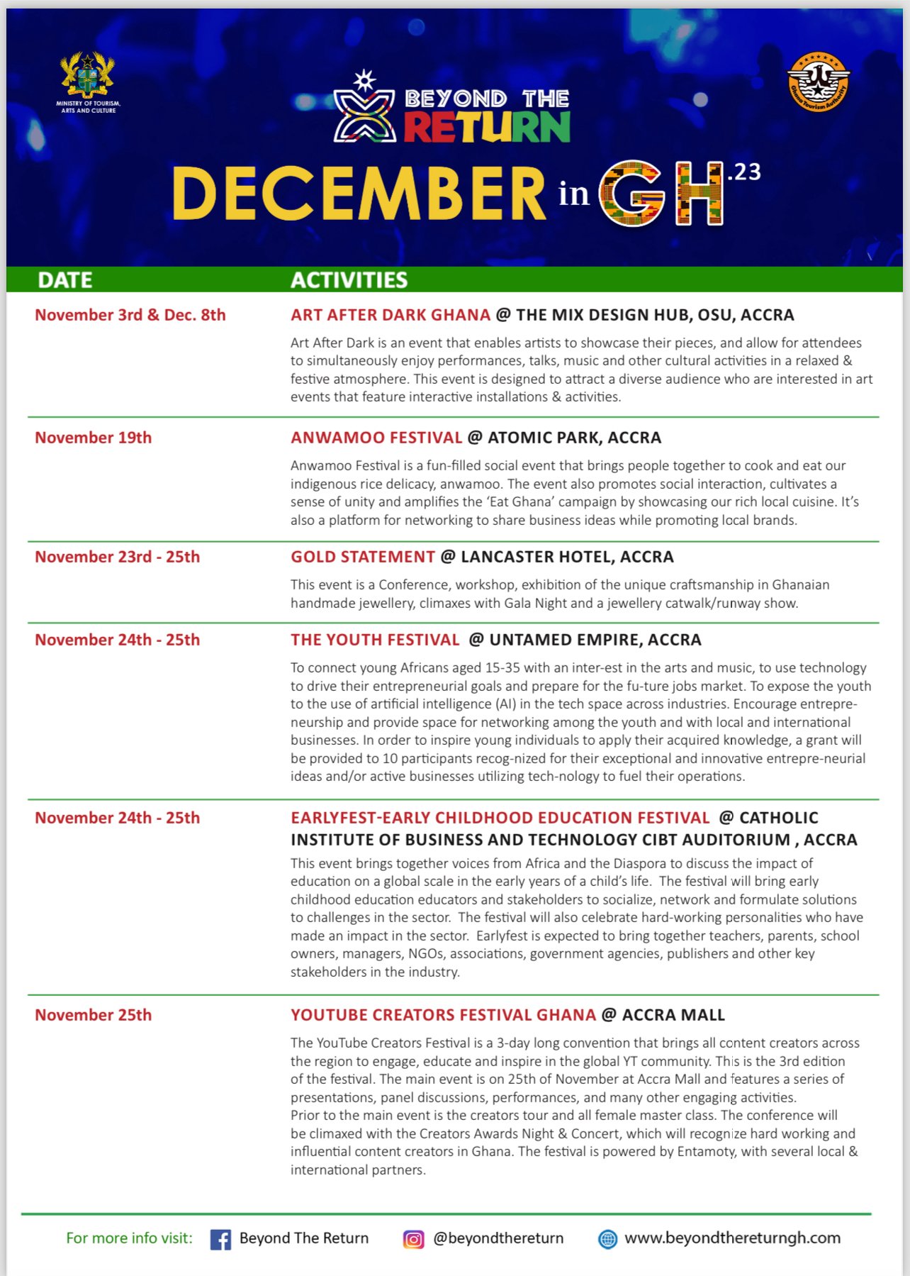 Welcome to our exciting sneak peek into the upcoming December 2023 activities in Ghana! As the year draws to a close, our vibrant and culturally rich nation is gearing up to celebrate the holiday season in style. From lively festivals to thrilling events, this December promises an array of experiences that will captivate your senses and immerse you in the beauty of Ghanaian culture. Whether you're a local or a diasporan looking for a unique way to end the year, this guide released by The Ghana Tourism Authority as part of the Beyond the Return activities will take you on a journey through the diverse and trending festivities that await. The past few years have seen food, drinks and music festivals within the country as well as talks and seminars on the future of tourism in Ghana as well as opportunities for the diasporas. Hopefully you've saved up enough to attend at least five festivals! 😆