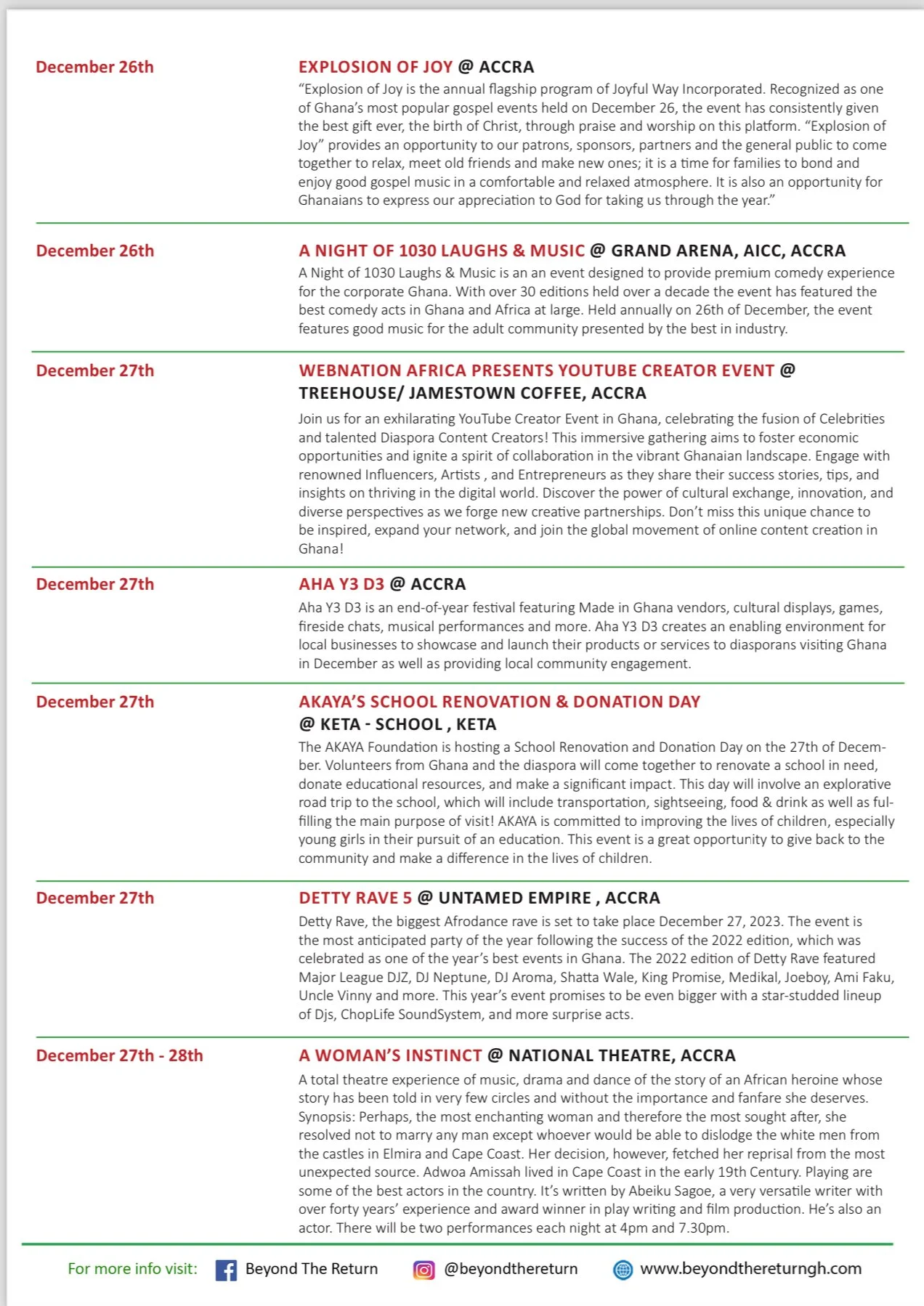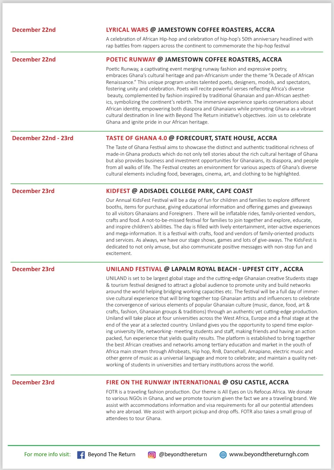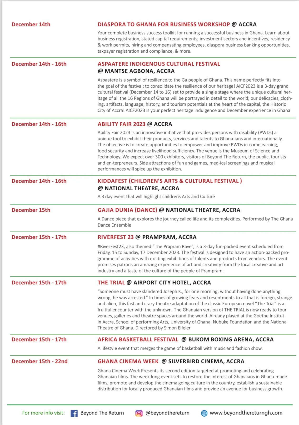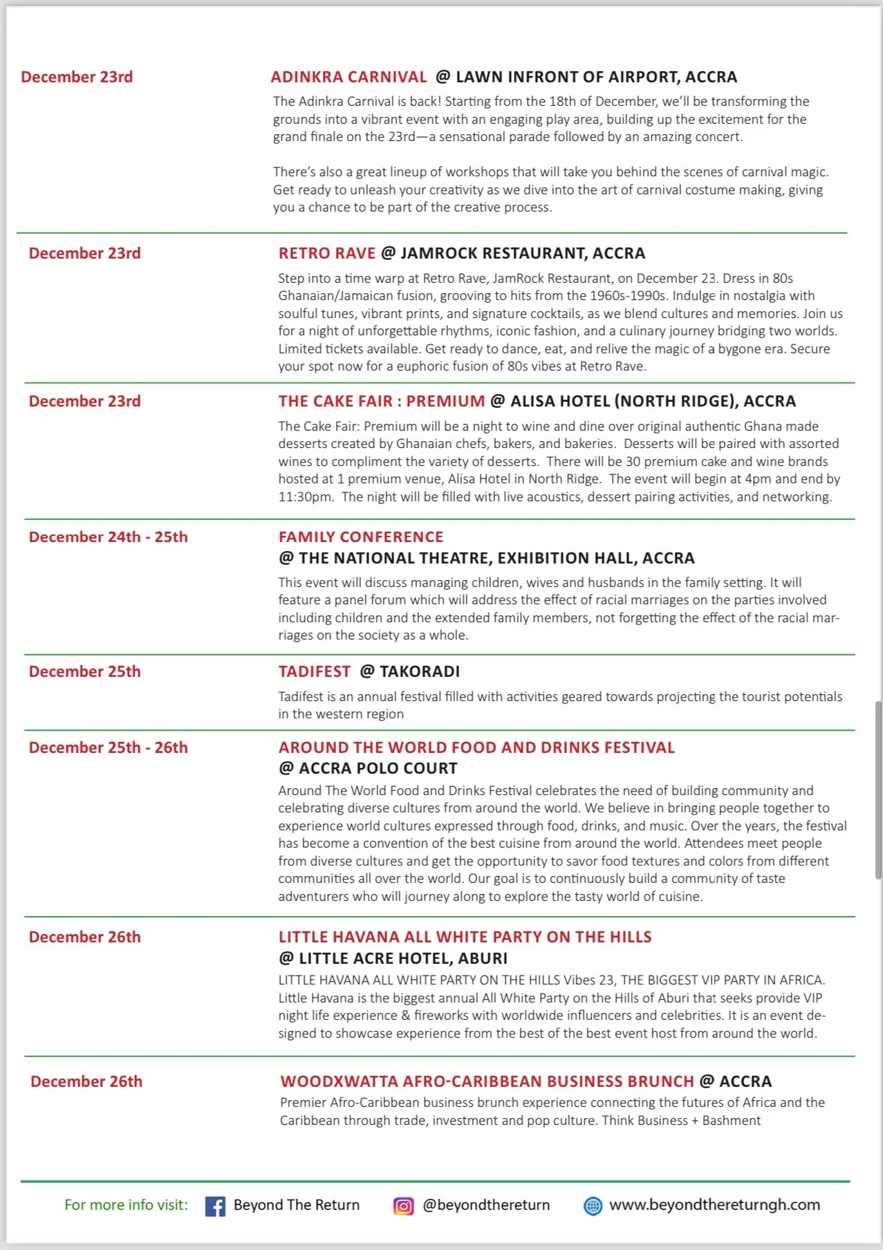 Welcome to our exciting sneak peek into the upcoming December 2023 activities in Ghana! As the year draws to a close, our vibrant and culturally rich nation is gearing up to celebrate the holiday season in style. From lively festivals to thrilling events, this December promises an array of experiences that will captivate your senses and immerse you in the beauty of Ghanaian culture. Whether you're a local or a diasporan looking for a unique way to end the year, this guide released by The Ghana Tourism Authority as part of the Beyond the Return activities will take you on a journey through the diverse and trending festivities that await. The past few years have seen food, drinks and music festivals within the country as well as talks and seminars on the future of tourism in Ghana as well as opportunities for the diasporas. Hopefully you've saved up enough to attend at least five festivals! 😆